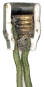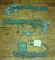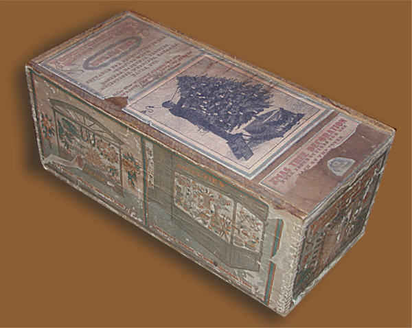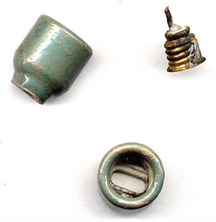 A. This extremely rare Touch The Button outfit is circa 1904, and it is believed that the outfit was manufactured by Jaeger. The name "Touch The Button" is a reference to the early push button wall switches of the time. Jaeger is the same company that offered Santa Claus Electric Candles outfits in similar wood boxes. Apparently, there were two Jaeger brothers who each headed their own electrical company. It is probable that this Touch The Button outfit was sold by one of the companies, and the possibility also exists that it was manufactured by one of the Jaeger companies and then sold through a third party. B. A view inside the box showing the restored covered lamp compartment. The outside of the box shows year around uses for the outfit, including decorating dining rooms for parties, store front windows and the like. The only mention of Christmas use is on the lid of the box. Remember, during the years the set was sold, it was prohibitively expensive for the average family, so companies tried to emphasize the fact that the set had many uses other than Yuletide decorating. C. Inside the restored lamp compartment shows spaces for 25 lamps- 24 for the festoons and one spare. The lamps are American made and are of the outside painted carbon filament type, with porcelain insulators in the bases and the early "tin can" type center contact button at the bottom. D- Here are two of the three festoons in the set, along with the green glazed porcelain junction box and the screw-in type current tap. The cord is silk covered, and each festoon has eight porcelain sockets. E- The third festoon in this set is currently being restored. One of the sockets had ancient black electrical tape around it, likely to protect little fingers from the socket which had apparently been dropped, as half of it is missing. While unfortunate, it does afford us the opportunity to see what the inside of the unit looks like. The brass shell is held in place with some type of tar or resin like material, which can plainly be seen between the wires in this photo. The tar/resin also acts as a stabilizer and insulator for the wires in the socket shell. F- Luckily, the tar or resin in the sockets is so very old that it is crumbling, offering this collector a very rare opportunity to actually disassemble the sockets without damage. Shown here are a top and side view of the porcelain socket shell, as well as the brass socket insert itself. Almost all outfits of this vintage are impossible to disassemble like this, so it is a bit exciting to have the rare chance to bring this set back to like new condition. The outfit is missing two sockets, so the search is on for a pair of replacements to complete this final festoon.