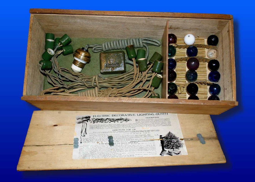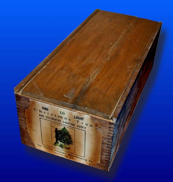 Upon close examination, it is apparent that the embossing On the long side of the box, the area where the words "with Edison" appear has been deeply and evenly ground away. Later, it appears that the words "with Edison" have been ink-stamped (not embossed) in the same area. On one end of the box, the words "General Electric Company, Harrison, N.J. USA" have also been ground away. Strangely, the same words have been ink stamped back on. This collector speculates that it is likely that the manufacturer of the wooden box for the GE lights originally altered it to make use of it to sell another brand of lights in. The removal of the words "with Edison" and "General Electric Company, Harrison, N.J. USA" would make the box rather generic in nature, and could easily accommodate any brand of lights. Why the box was later converted back to include the GE nomenclature remains a mystery. This collector also wonders why the alterations were done to only one side of the box. There are many examples of cardboard light boxes factory altered to accommodate different brands of lighting outfits, but this is the first time that this collector has seen these practices on a wooden box. Existing advertising evidence from General Electric supports the conclusion that GE stopped producing their series wired lighting outfits around 1915, or perhaps as late as 1917, the advent of World War I.