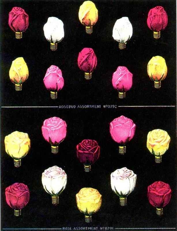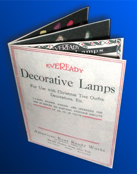 A- Catalog of American Ever Ready Works Decorative Lamps, July 1, 1919. The catalog is of series-type Christmas and all-occasion lamps, for use on circuits of 100-120 volts. All lamps are miniature base models. It is unclear at this point if the American Ever Ready Works actually manufactured or imported the lamps, but they appear identical to styles imported from Germany by other companies. Research is ongoing as to the true origin of lamps like these. B- Close up of the catalog cover C- Assortment 0794- Birds D- Assortments 0793-Lilies and 0797-Animals E- Assortments 0800-Small Fruit and 0801-Large Fruit F- Assortments 0795-Assorted Figures and 0796-Assorted Figures, including Halloween G- Assortments-0791-Large Roses and 0792-Small Roses