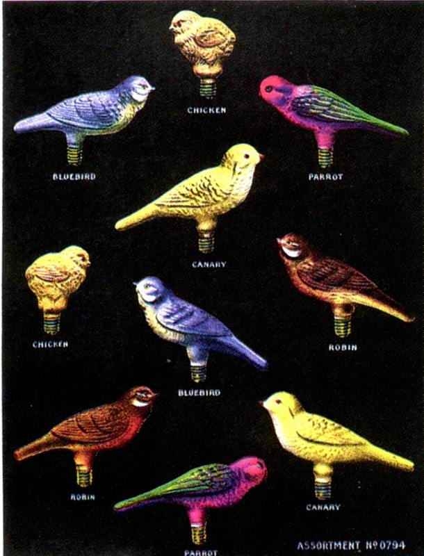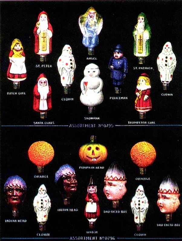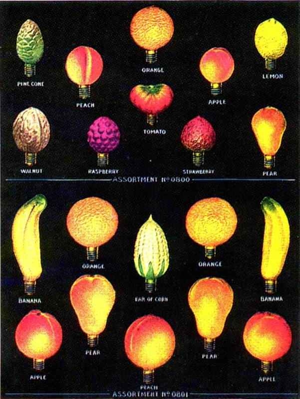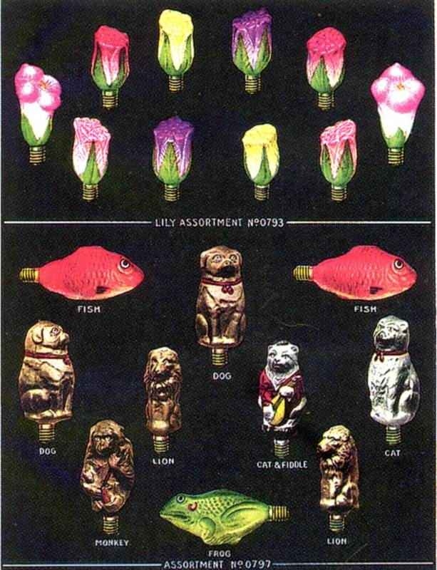 Figural Christmas lights first became available in America in about 1906, and in 1908, the Sears and Roebuck catalog featured a small offering of the lights. It is interesting to note that they were offered for battery powered use as table decorations, with no mention of putting them on the Christmas tree. Here is the catalog listing: