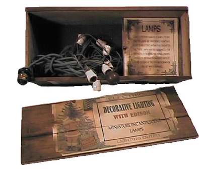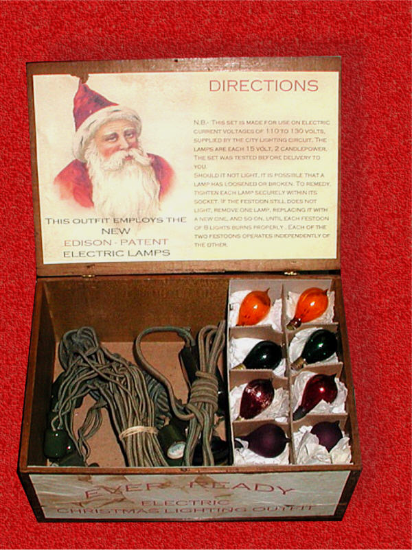 CLICK HERE FOR THE TABLE OF CONTENTS PAGE AND LINKS TO ALL PAGES ON THIS SITE TABLE OF CONTENTS HISTORY THE TIMELINE MANUFACTURER'S HISTORIES THE PATENT PAGES THE PRE-ELECTRIC ERA VINTAGE ADVERTISING THE LIGHT SET GALLERIES RELATED LINKS LIGHTING OUTFITS: 1900-1920 Home electric lighting of Christmas trees was not truly practical until 1903, when General Electric first offered pre-wired lighting outfits, complete with miniature Edison lamps, for sale to the general public. Prior to that, consumers had to hand wire socket-less light bulbs onto the tree themselves, a tedious task at best. Here is a picture of one of the earliest Christmas light bulbs known and an 1899 catalog illustration of the same type of lamp: