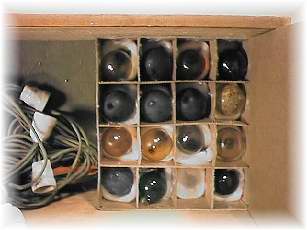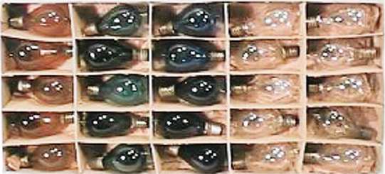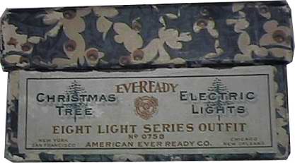 A- An Ever Ready outfit, circa 1918. This outfit demonstrates a very early use of miniature base flame lamps from Japan, with much larger glass envelopes than the later bulbs. These lamps have carbon filaments. B- This is a box of imported Japanese carbon filament replacement bulbs. Boxes like this contained "balanced" lamps, all of relatively even brightness. One of the disadvantages of carbon filaments is that the light output of individual units is very difficult to control. Factories therefore offered lamps in matched sets so all of the lamps on a string would burn with similar intensity. Circa 1918. C- Manufactured by Ever Ready, this is a very typical outfit by that company. Circa 1915, this example is an 8 light set- the company offered outfits in 16, 24 and 32 lamps as well. Included with the kit are spring clips, that when inserted into small holes in the socket bases allow the lights to be attached to tree branches. The top picture is of the end label on the box.