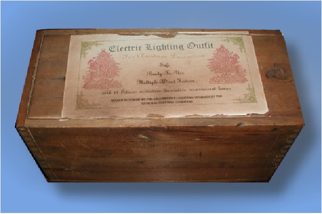 In the early 1900s, electricity was still a bit of a novelty, and the sight of a glowing electric tree was a wondrous one indeed. But the cost was quite prohibitive, and the general population was more than content to stay with their time honored candles for holiday cheer. Those who were not wealthy and still wanted the novelty of an electric tree were sometimes able to rent an outfit from the local department store. Below is a set designed solely for rental purposes. It is packed in a very sturdy oak box, and is nicely finished so as to attract attention when placed in a store window. This outfit contains eight lamps plus a spare, and was suitable for a table top tree: