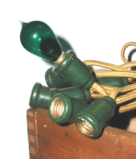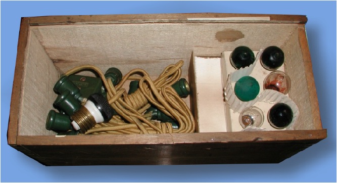 A- This outfit is the earliest in my collection, and is quite rare. Circa 1905, it was manufactured by General Electric. Normal outfits of this era use 15 volt lamps and are series wired, meaning that if one lamp goes out, they all go out. This set is parallel wired, so the failure of a single lamp will not affect the operation of the others. Using candelabra based 110 volt lamps, the light string employs white porcelain sockets and copper wire with a green silk braided covering. The power connector is a typical screw-in plug. B- Here is a close-up picture of the lamp compartment. Two spare lamps are included with the outfit, and all of the bulbs are protected in the divided area with a hinged lid. The lid has detailed instructions for proper operation. C- This is a close up-picture of one of the lamps in the set. The color is applied to the glass envelope with a very delicate water soluble paint, which damages easily. One of the disadvantages of early lamps of this type was that they burned at an alarmingly high temperature-high enough in fact to cause a serious burn. 120 volt lamps with a carbon filament were actually not suitable for Christmas decorating, and this is one of the reasons for the rarity of this type of set. Series wired sets with 15 volt bulbs burned much cooler, and were by far the most popular selling outfits until after World War II.