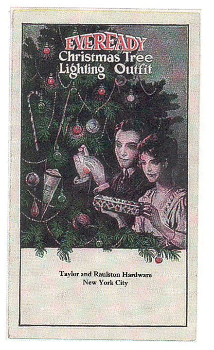 decorating their Christmas tree with Eveready brand lights. Notice that