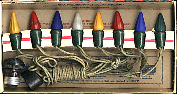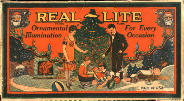 The classic NOMA box, from that company's first full year operating as NOMA Electric Corporation, 1927. The outfit has ribbed cone tungsten filament GE MAZDA lamps. Later versions of the outfit are in a box of the same design, but with less color. This box design was used well into the 1930s.  |