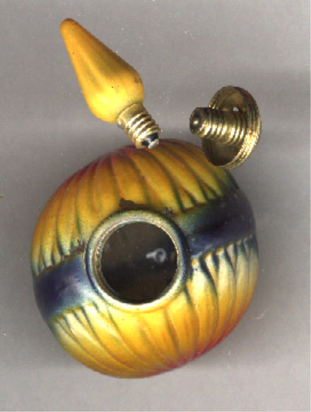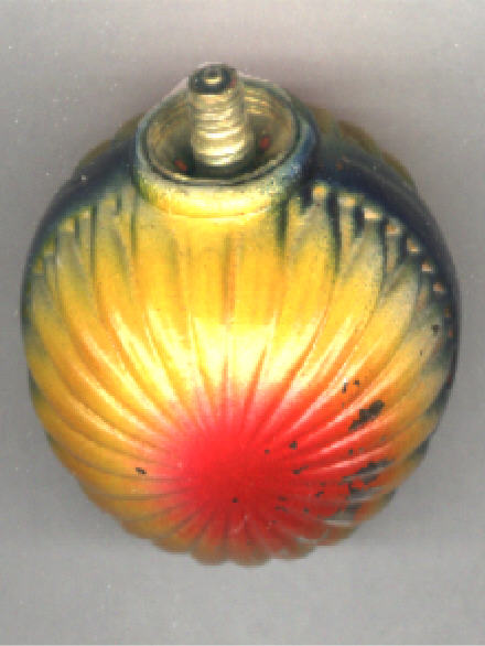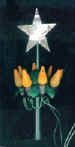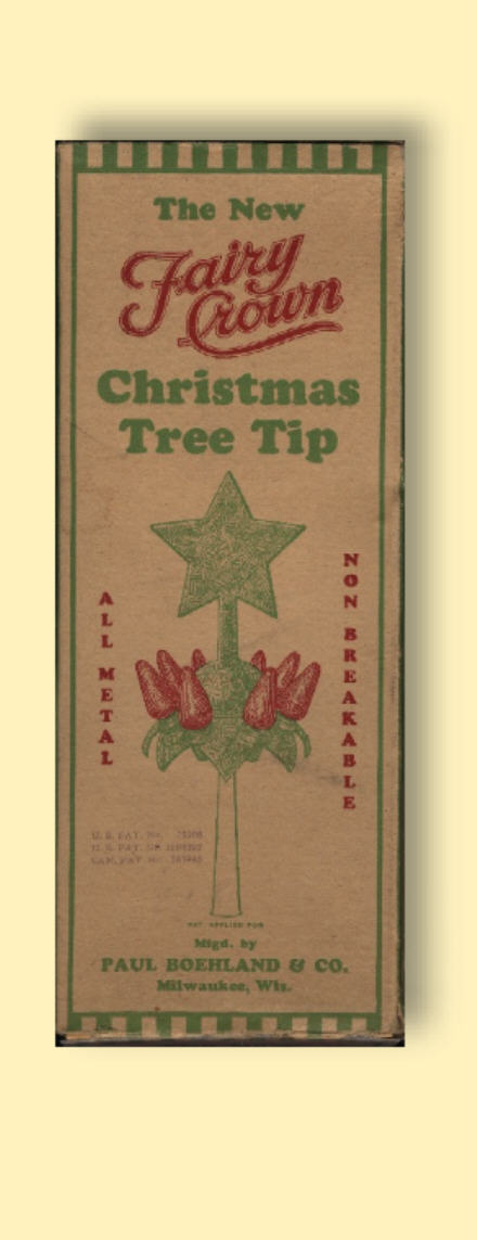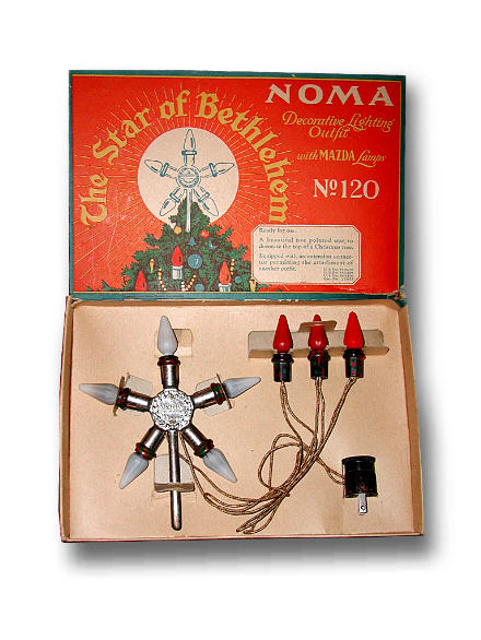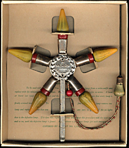 | Metal Tree top stars were first introduced in the early part of this decade by the Propp Company. Consisting of a five pointed star and three candle lights to make a string of 8 lights, the set was a popular seller and continued to be offered by NOMA after their merger with Propp. Starting in 1928, NOMA also offered a "pigtail" version of the topper which is pictured below, designed to screw into an existing string of lights as a substitute for a single bulb. These stars continued to be sold well into the 1930s. Paul Boehland and Company sold the unusual tree topper on the right, called the Fairy Crown Christmas Tree Tip, beginning in 1927. It was patented in 1928 and assigned number 1,690,397. The purchaser supplied their own lighting outfit of eight sockets, which were then placed into the socket holders surrounding the device. When new, the metal star had much more metallic glitter on it. | |||