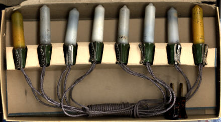 Through the kindness of a friend, I was able to add this hard to find set of candles from Royal to my collection. As with the NOMA and Paramount sets featured above, this outfit used the GE candle lamps, and was featured in Royal's catalog as being available with all white, all yellow or assorted color candles.  |