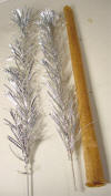As is almost always true with a successful product, imitators soon jumped on the bandwagon, and the market was flooded with a huge variety of aluminum wonders, not only in the original silver color, but now in gold, green, blue, a blue and green combination, a silver with blue tips and even pink! Due to the extreme danger of using electric lights on the highly-conductive aluminum branches, rotating multicolored floodlights, called color wheels, were sold to illuminate the trees. (CLICK HERE for the Color Wheels page of this website.) Trees were offered for sale by most of the major Christmas lighting companies, including NOMA, Paramount and TIMCO. The heights of the silvery wonders ranged for a tiny one foot table top tree up to a 7 foot monster. there were even half trees produced for wall mounting in offices and stores. the variety was seemingly endless. Along with The Aluminum Specialty Company, other companies offered the glittery wonders, including Star Brand Company in Portsmouth, Virginia, Regal Electronics in Chicago, Illinois, And Fairyland Trees. But, almost as quickly as their popularity soared, public interest in the trees started to fade. They would soon be declared a symbol of the crass commercialism of Christmas, and when, in December of 1965, the first airing of A Charlie Brown Christmas appeared on CBS, the buying public seemed to take to heart the refusal of Charlie Brown to buy as his symbol of the Yuletide season "the biggest aluminum tree he could find, maybe even painted pink". By 1968, most companies no longer listed them in their catalogs. Today, collectors will pay a high price for some of the less common trees, especially in the colors other than silver. The average selling price for a vintage silver-colored aluminum tree in good condition is about $15 per foot of height. Expect to pay a premium price for a pink tree, the rarest of all of the colors offered. Trees of any color that are especially full, or have the pom-pom branch ends will also command a premium price. Last year (December, 2000) reproduction trees appeared on the market, and were surprisingly good sellers. Expect to see more of them offered in future years.   Each of the fluffed branches was then inserted into an individual cardboard sleeve for packing. Typical trees had all branches the same size-it was the angle of the holes drilled onto the trunk that actually "shaped" the tree. Even the topmost branch, which was stuck into a hole on the flat surface on the top of the trunk, was the same size as all of the others. All of the branches were identical, so assembly for the consumer was a breeze. To the right is a picture of a fancy "Pom-Pom" type of branch, a feature exclusive to the more costly trees. The ends of each branch were flared out, giving the tree an extra high level of sparkle and glamour. The pom-poms have suffered over the years in storage, as keeping them compressed for eleven months of each year had a tendency to compress them, and the yearly re-fluffing soon resulted in detached needles. Trees surviving today with their pom-poms intact are a collector's dream.