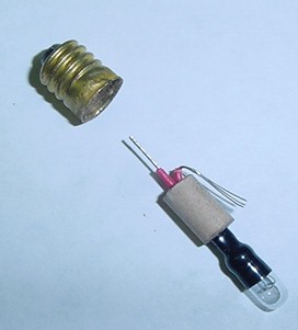 So, this brings us to the point of connecting the parts together. In the pen stopper you drill a hole in the side near the ridge, about 1.5mm in size. This is for the side bayonet earth provided by a small brass washer that fits over the shaft of the stopper down to the point where the 1.5mm hole is. Then, drill a hole in the base of the stopper to allow a small brass eyelet for center connection (check photos below).  Now, take the wired bulb
