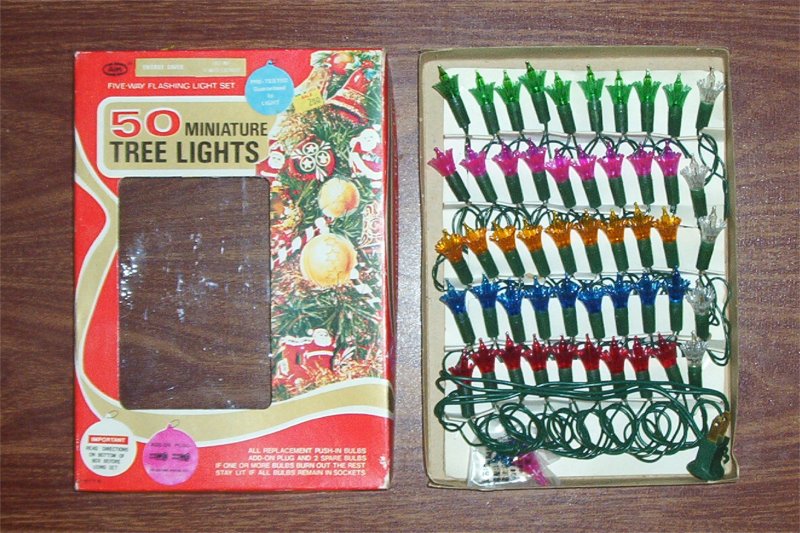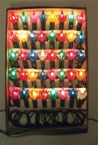 The main focus of my collection is the Miniature lights made from the 1960's to the 1980's, when light sets used plastic as the main material. Reflector lights with "petal" style reflectors were popular during this period. These sets were discontinued in the late 1980's because they could not meet the more stringent safety standards that had been imposed by Underwriters Labs. The outfits had miniature bulbs surrounded by a plastic reflector which made the bulbs appear brighter. The "petals" of the reflectors acted like tiny lenses to magnify the light. These sets mostly used 6 Volt bulbs, brighter than the 2.5 volt bulbs used today. The big problem with these lights was that the reflectors were very fragile - don't let the set lay on the floor while putting the lights up or else - CRUNCH !!! - #*&# - I stepped on another bulb!  |