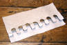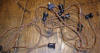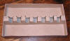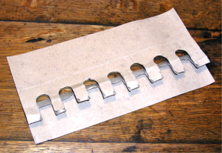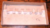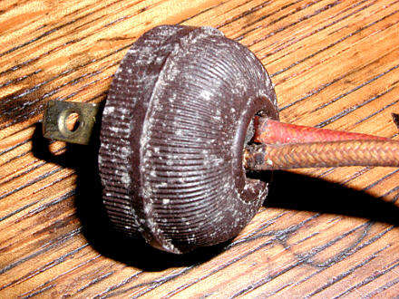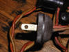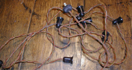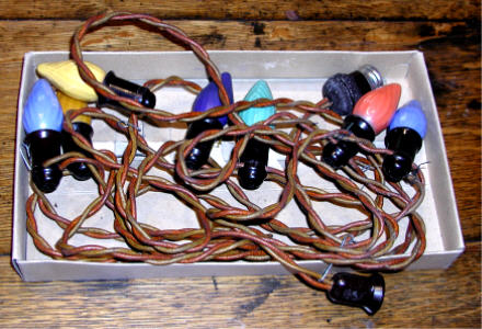 Here are three pictures of the outfit as I received it. There is old cellophane tape on all four corners of the box top, which are quite brittle and have discolored the corners. I knew in the beginning that this tape damage is not really repairable, but the tape shows to me that the former owner cared enough for the outfit to keep it in its original box, and lovingly made repairs to it over the years, which is really more important to me than a pristine set. The insert to hold the lights was present, but was flattened, torn, discolored and dirty. There were also several old ornament hooks in the box which predated World War II, and quite a few mica flakes indicating that at one time the owners used the lights on a prewar flocked tree. Here's the misshapen insert removed from the box. Sometimes these inserts can be ironed flat again, and reshaped to fit back in their box properly, and other times, the cardboard is so brittle and delicate that reshaping will only cause more damage. Luckily for me, this one was still fairly flexible. I will attempt to use a steam iron to restore it. The ironing process was quite successful! Although the house now smells like a really old garage, the insert took well to a very warm iron and a bit of steam, and flattened out perfectly. The tears have also been repaired with non acidic archival quality glue available from most art supply stores. (I use Aileen's brand acid free white glue for my repairs.) The reshaped insert is now back in its box. Some of the staining has been removed with a gum eraser, and a quick wiping with a slightly damp cloth has taken care of a lot of the dust and grime that collected over the years. Now we start work on the cord. It is in really good shape, and other than being a little stiff, the only problem is that the plug has some discoloring from mildew stains. This view shows the staining, and also the good condition that the varnished, braided cotton covered wire is in. A little buffing with a soft cloth wheel on a Dremel Moto Tool has made short work of the staining on the plug. Bakelite has the amazing ability to take a polish quite well, and, despite the age of this piece, it restored nicely. I also took the opportunity to polish the plug blades a bit too. Now for the most time consuming part of the restoration-getting the light string back in the box in a manner that resembles the way it originally came from the factory. This is an intermediate base set of lights, and as such, the sockets are large, the wiring thick and stiff with age, and to make matters worse, the varnish covering the wires to weatherproof them has become a bit brittle. To make the wires easier to handle, I warmed them in a 175 degree oven with a bowl of water (not IN the water), and as the heat and humidity began their work on the wires, they became softer and more workable for a time. There is always the concern that the stiff wires will crack with too much handling, so I really take my time with this step. ![]()