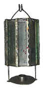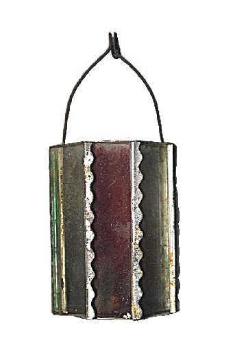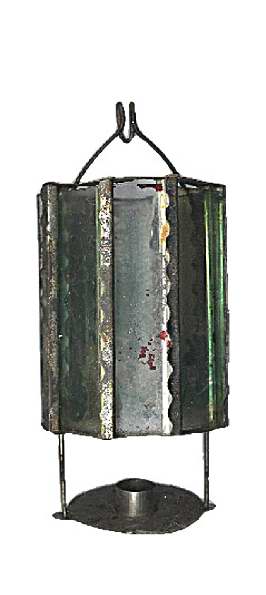 Below is pictured a Christmas Lantern, manufactured in 1871 of tin and colored glass. The outer glass shell slides up to facilitate the lighting of the taper within: