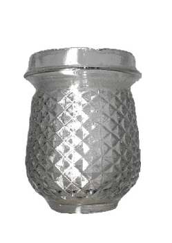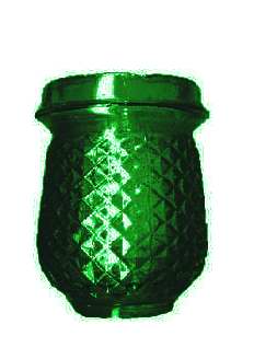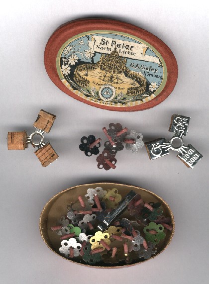 Assorted glass "Christmas Lights". These units held water and cooking oil, and the wick device shown below was floated on top. When lit, these lights give a beautiful, sparkling effect in a darkened room. All of these examples are American, and date circa 1905. Other common uses of these delightful lights were as welcoming beacons on walkways and porches, window or mantle lights. In addition to the use of oil and water, some people used small candles, similar to the votive candles we use today. Other popular names for these lights are "Fairy Lights" and "Candle Cups". Below is a German made floating wick kit for use with the Christmas Lights All of the Christmas Lights shown above are in the "quilted" or "diamond" pattern, just one of the many pressed, mold blown or free blown patterns that collectors seek today. There were even lights molded in the likeness of popular political figures of the day, including Queen Victoria.