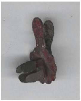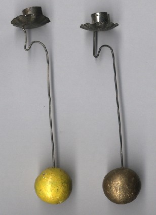 Several devices were available to attach plain candles to the tree. Below are two examples- one a "counterweighted" holder designed to always keep the candle upright and patented in 1867, and the other a simple candle clip. The counterweights are painted clay balls, and the single candle clip was once a much more cheerful red.