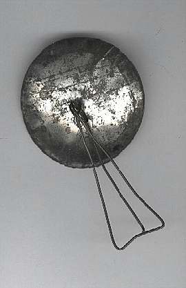 Below is an unusual and rare German "bough clip", dated 1876. It was designed to hold the candle out and away from the tree needles. It was not a successful invention, however, as the method used to hold the candle to the device was simply a spike which was to be inserted into the base. With the tapers being so small, the spike often cracked or split the candle at the base, making it useless. These clips were marketed for only two years.