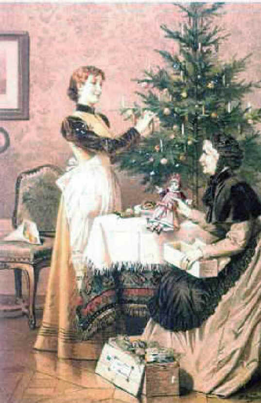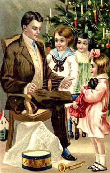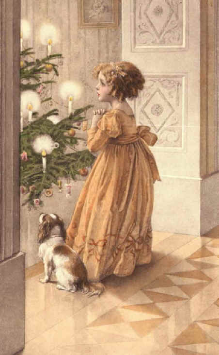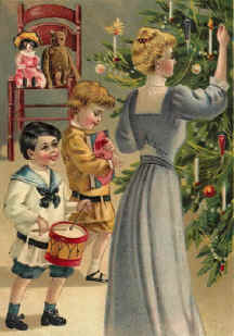 The lighting of the tree late on Christmas eve or early Christmas morn' was an exciting affair. Parents would stand on each side of the tree, lighting the candles quickly from top to bottom. As the last taper was lit, the children would be invited into the room to share in the wonderment of the glowing tree. Sadly, the candles would only burn for a precious few minutes, and all too soon it would be time to blow them out. Some families would replace the candles for a re-lighting ceremony late in the evening, when the family would gather once more to make private Holiday wishes for the upcoming New Year. Scenes from pre-1910 Christmas Postcards