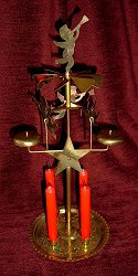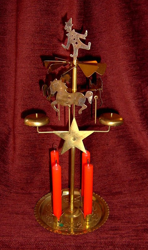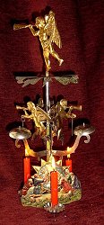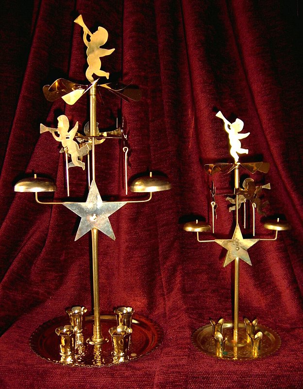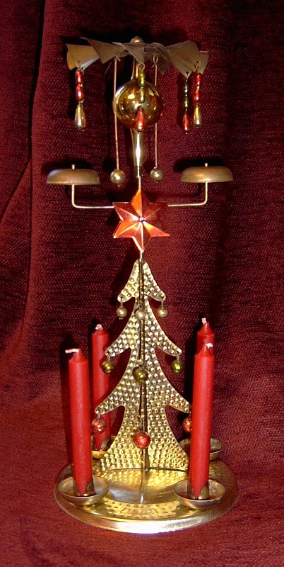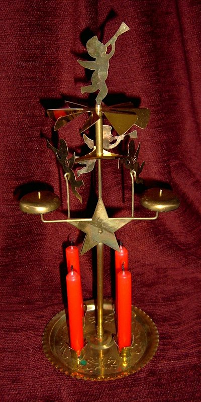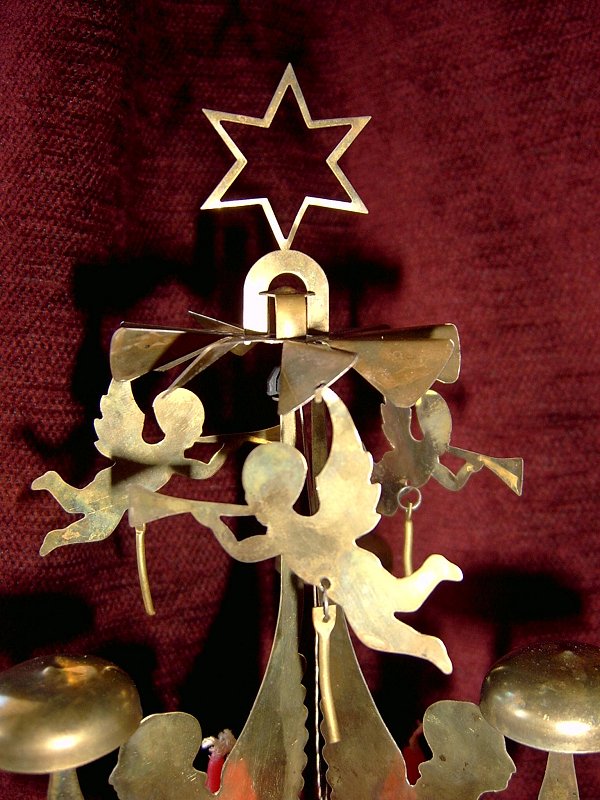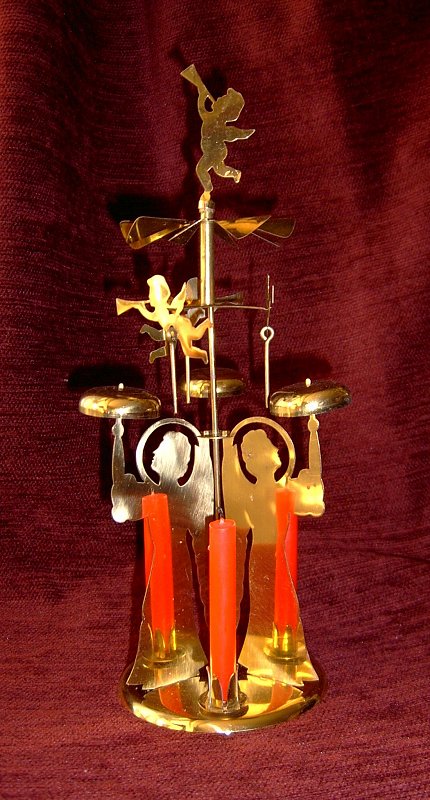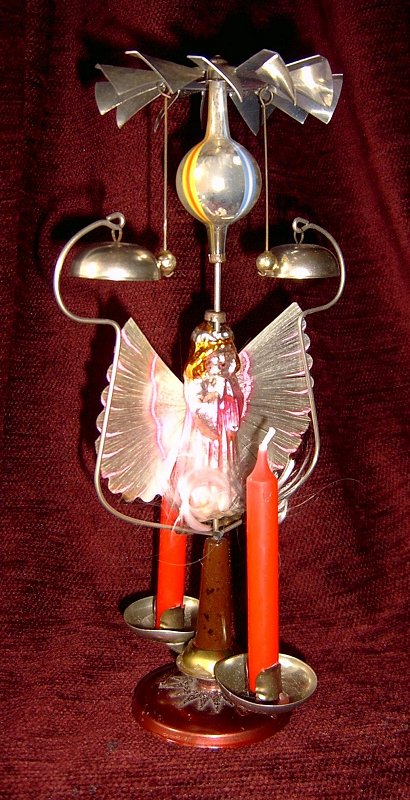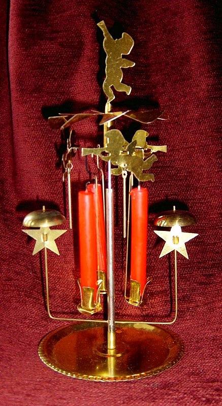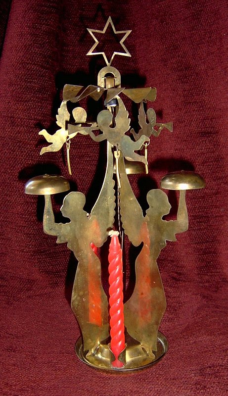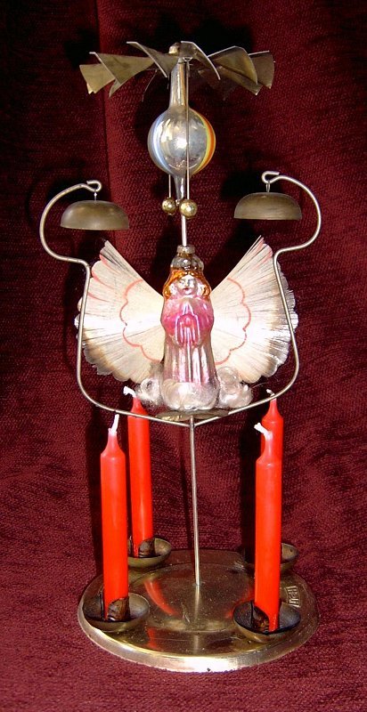 Before World War II, most candle chimes were made in Germany of lithographed and/or polished tin, exhibiting — like