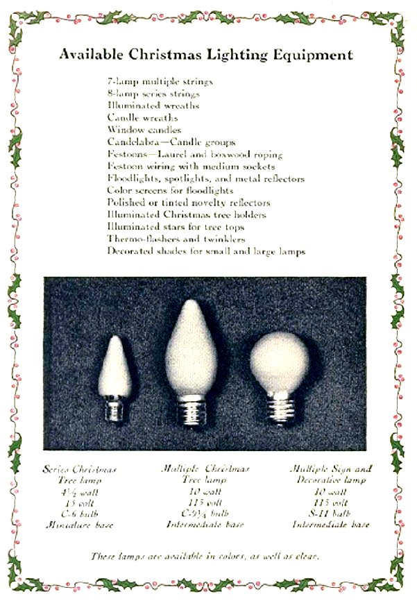 1928- From The National Lamp Works Division of General Electric, this brochure page shows the three types of lamps commonly used in Christmas decorating at the time, both indoor and outdoor. It is interesting to note that the picture shows a smooth cone type of C-6 lamp, although they were no longer available. The smooth cone envelopes were dropped by about 1925 or so, in favor of the flame or textured variety.