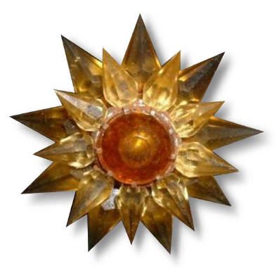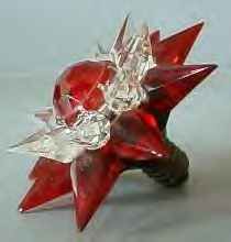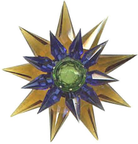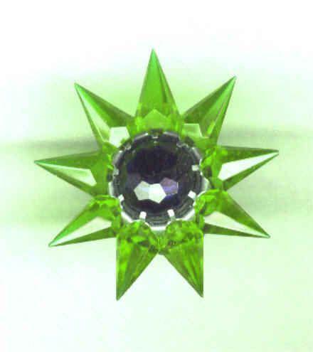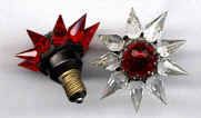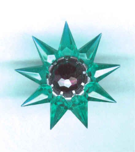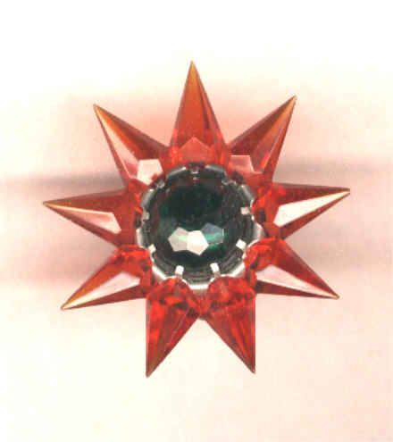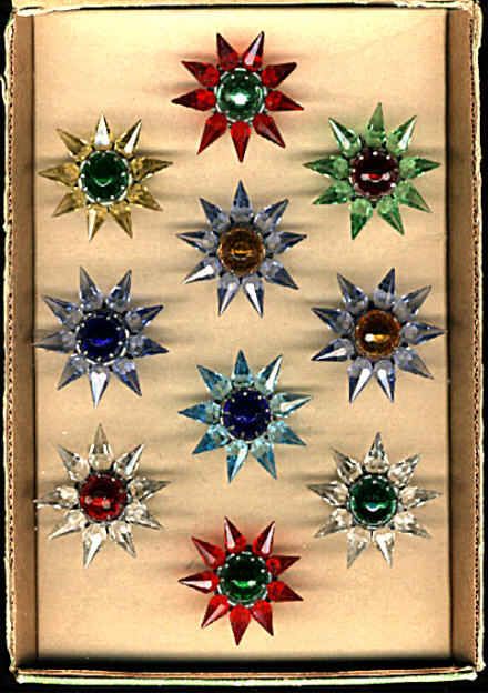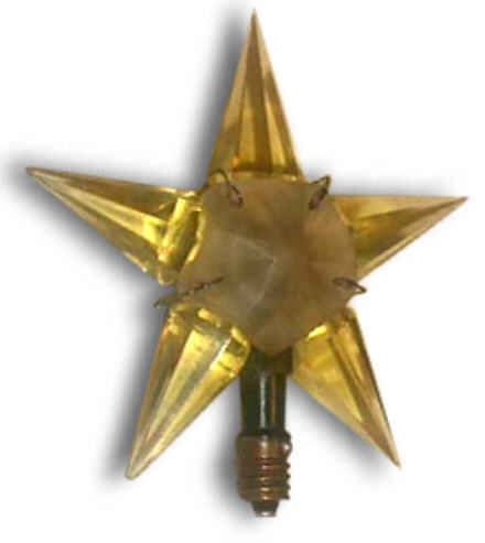 Collectors who have researched these lights say that the Matchless Company did practically no advertising of this product, and references to the Stars can only be found in catalogs of the time. The 1939 and 1940 editions of Montgomery Wards Christmas catalogs feature them, and several hardware trade catalogs show the Stars. Matchless sold their Stars through the Marshall Fields stores as well. A major downside to these beautiful lights was their price-usually between 18 and 20 cents for a single row series 100 Star. While seemingly inexpensive in today's dollars, keep in mind that America was dealing with the effects of The Great Depression, and money was tight. An average Christmas tree of the time would feature between 40 and 48 miniature base series wired lights, and to fill the tree with Matchless Stars would have cost about $7.60. A typical boxed set of eight standard Christmas lights with the electrical cord sold for 65 cents in 1937, and a dozen eggs went for 12 cents. Spending almost $8.00 on Christmas lights was beyond the reach of many, so the Matchless Company wisely offered their Stars for sale singly as well as in sets of eight or ten. The company offered their Stars in many different color combinations, with both clear and frosted crystals. The frosted varieties are by far the hardest to come by. The colors making up the various combinations are shown in the chart below. Although many colors appear in the chart, they are actually manufacturing variations of only 8 basic colors. The points were offered in red, green, aqua, steel blue, amethyst, pink, amber and clear. The center jewels were produced in red, green, amber and blue. Milk glass center stones are occasionally seen, and are almost certainly Canadian products, and most of the Canadian-produced Stars are of a deeper color than those sold in the United States. In the chart below, variations of basic colors are grouped in parenthesis and shown in the first section only, although these variations appeared in all series of Stars. Due to the Communist occupation of Czechoslovakia after World War II, the Matchless company found it difficult to obtain the proper quality glass crystals needed for the manufacture of their Stars. A redesign became necessary, and the larger Stars were then made in Lucite, and molded in one piece instead of individual points.