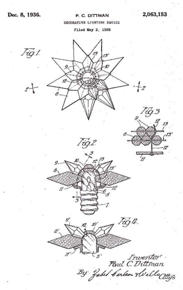 On May 2, 1935 Paul C. Dittman of Chicago filed an application for a patent for what he called simply "Decorative Lighting Device". In the patent he described it as "an ornamental device embodying a multiplicity of of prismatic light diffusing bodies with a light source..." He related that while he was aware that others had patented lighted stars, his offering was different in that the light would enter the rays of the star radially, effectively refracting the light within the ray and producing a "pleasing effect." His description of the refracted light produced by the stars was a bit of an understatement, as anyone who has seen them illuminated can attest: a lighted Matchless Wonder Star is stunningly beautiful. His patent was granted on December 8, 1936.