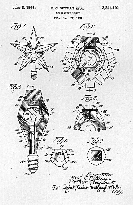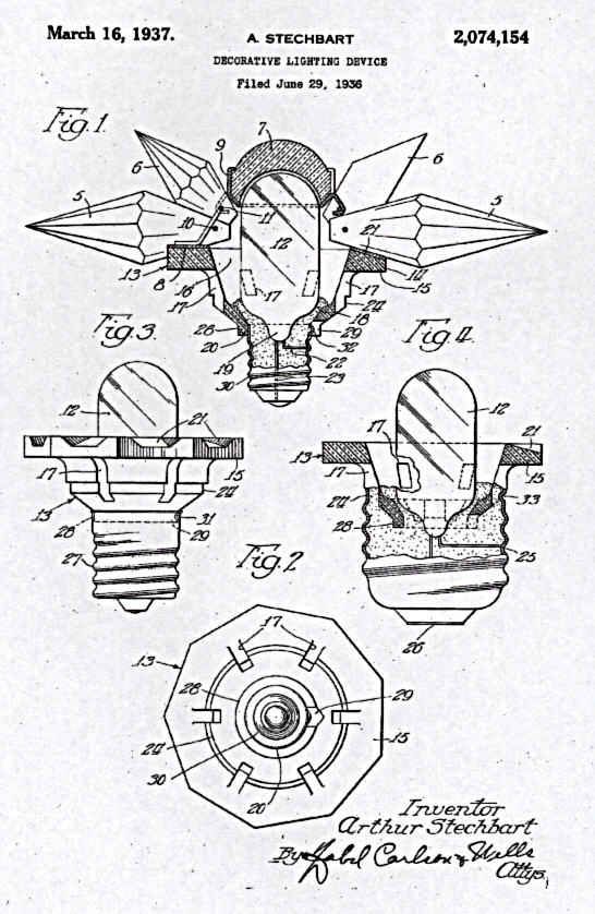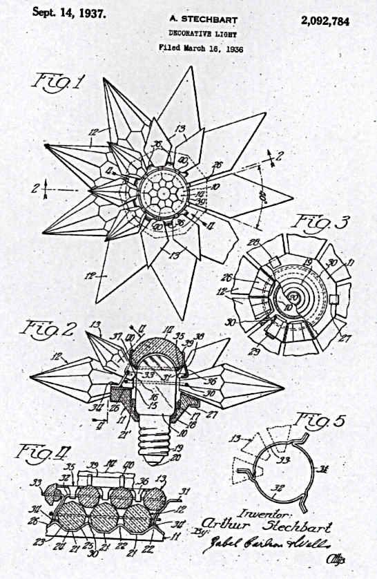 In March of 1937, Arthur Stechbart, an associate of Mr. Dittman's, was issued a patent for a variety of Matchless Star that had a bakelite base, allowing for different sizes of lamps to be used for illumination. Other patents were issued as well, even one a tree top version of the glass lights. Here are some of those patent drawings: