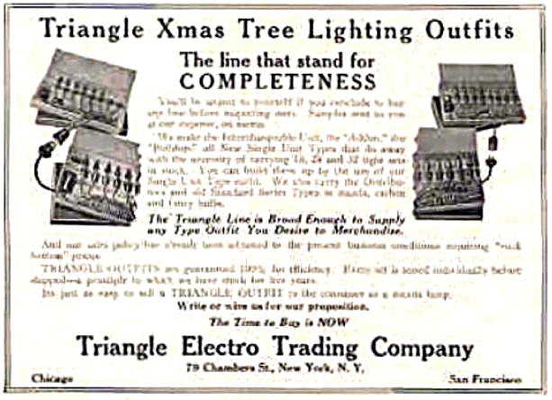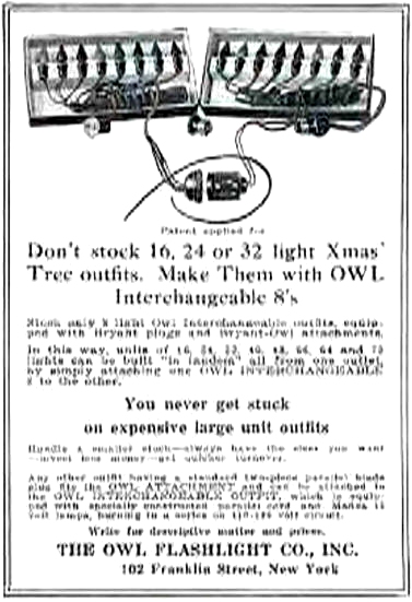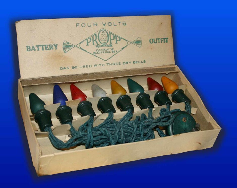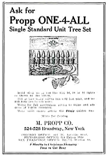 companies: As you can see, most of the companies had their own forms of "interconnecting" devices, which allowed multiple strings of lights to be connected together. Almost all of the Propp Christmas light sets from the early 1920s and onward included the "One-4-All" connectors, allowing their use with just about any other company's brand of attachments. This allowed Morris' sets to be instantly compatible with those offered by his competitors, and sales increased even more. Propp outfits were always "approved by the Underwriters," while some of the sets from the competition were not.
