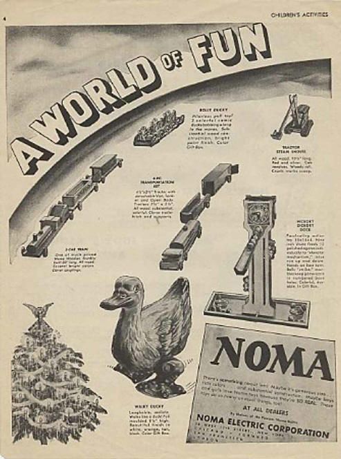 On October 29, 1929 the American stock market dramatically crashed. Within the first few hours of the Market's opening, it fell so far as to wipe out all the gains that had been made in the previous year. Since the Stock Market was viewed as the chief indicator of the health of the American economy, public confidence was understandably shattered. Between October 29 and November 13 (when stock prices hit their lowest point) over 30 billion dollars had disappeared from the American economy. It was to take nearly twenty-five years for many stocks to recover. Suddenly, far fewer families could afford luxuries like electric Christmas lights, let alone find the money to pay the electric bill. Food, clothing and shelter became the priority, and Christmas celebrations were soon to become mere ghosts of what they once were for many families. With the Crash beginning just two days before NOMA's third selling season began, the outlook was bleak. Every American company had their work cut out for them, but especially NOMA. Realistically speaking, the Company did not make goods considered essential for day to day living. To make matters worse, the Company's business was largely seasonal, consisting of many months of pure manufacturing, all for a mere three months worth of selling. Company President Morris Propp directed that NOMA Electric immediately increase the Company's advertising efforts, emphasizing the importance of a properly celebrated Christmas in trying times such as these. Ad copies were filled with warm and cozy family scenes, with children happily gathered around a well lit tree. The advertisements worked. NOMA enjoyed surprisingly strong sales in 1929 and 1930, and continued to do well through the Depression years. The company management showed excellent flexibility, responding to changing market conditions and consumer trends with aplomb. NOMA catalogs during this time were colorful, well laid out, and each year brought new products and innovations. It seemed that NOMA alone was keeping the Christmas lighting industry vitalized, and other, smaller companies scrambled to keep up with them. It was actually during these years that NOMA firmly established itself as the leading Christmas light manufacturer in the world. With the advent of World War II in 1941, all American companies, NOMA included, turned their attentions to the War effort. Due to wartime materials restrictions, NOMA and the other lighting companies then in business were unable to make Christmas lights. Advertisements from the company in Life magazine declared that "With Peace, NOMA Christmas lighting products would be back..." NOMA was able to manufacture a line of wooden toys during the War years, and also, surprisingly, manufactured bombs and fireworks under their newly-formed Triumph Industries division. It is ironic to note that NOMA-manufactured bombs were used in the War to heavily damage many Japanese factories, figural Christmas light factories included. Those same factories would later rebuild, and their products, imported quite cheaply in the 1950s and 60s, were to become one of the major factors in the eventual bankruptcy of NOMA Lites, Incorporated. Along with the manufacture of War materials and goods, NOMA also made a line of wooden toys, called NOMA Woodies, during the War years. Consisting of non-restricted materials, the toys were inexpensive to make and filled a strong need during the years when toys were hard to come by. Henri Sadacca had done quite well in leading his company through the Great Depression and World War II, and the postwar years were to be some of the most profitable ever for the Company. In 1946, NOMA first marketed the wildly successful Bubble Lites, once again changing the American Christmas lighting industry forever. See the Bubble Lights section of this website for a detailed history of the development of these fascinating lights. |