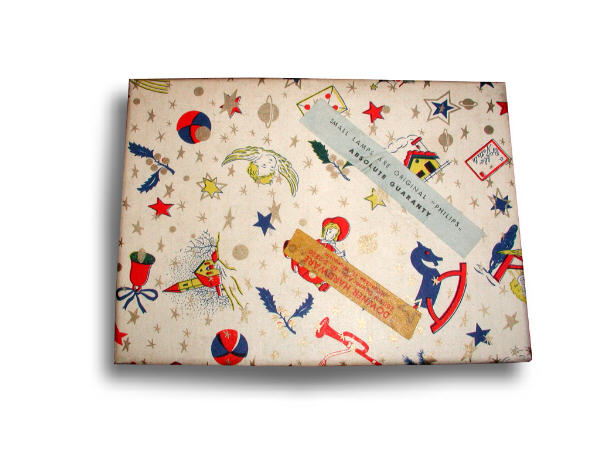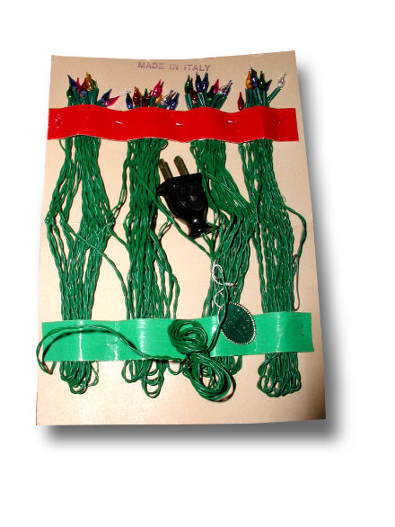 The mid 50s saw the introduction of miniature lights to the American market, produced first in Italy, but later in Japan and other countries as well. These new lighting sets were foremost inexpensive, but satisfied the growing public demand for more lights on a tree without overloading the electric circuit. The earliest outfits were crude by American standards, consisting of twenty or thirty tiny hand blown lamps permanently wired into a thin and delicate string. These imported sets were not UL approved, but began to sell amazingly well despite their poor quality and lack of safety approval. NOMA began to feel the financial strains of competing with these and other imported lamp sets. Another advantage of these strings of lights was the fact that the lamps each had tiny shunt devices in them, which permitted the string to continue burning despite the failure of one or more lamps. This benefit, in addition to the fact that they were quite novel for the time, contributed greatly to their popularity. NOMA, along with other lighting companies in business at the time, soon countered with their own versions of "expanded" strings of lights. One of NOMA's versions is pictured below: NOMA's outfit was UL approved, and was of much more substantial quality than the imported outfits, but was also much, much more expensive. The set used a transformer so that each lamp could burn independently, and NOMA also contracted with General Electric to manufacture twinkling lamps for the outfit, so that each lamp twinkled independently on the string. The effect was quite attractive, and the twinkling lamps made merry little pinging sounds as each one flashed on and off. But, the twinkling of the lamp caused severe electrical interference in both television and radio receivers, and soon NOMA had discontinued the set due to poor sales. As the 1950s drew to a close, it was most apparent that American tastes in Christmas lighting were beginning to change dramatically-and permanently. 1959 saw the introduction of