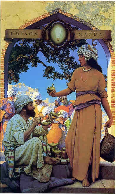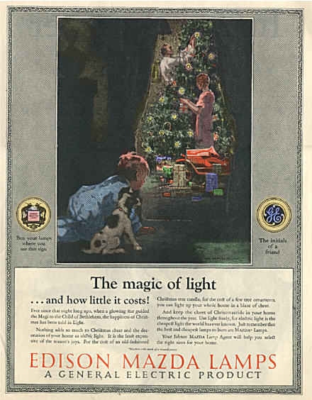 The Mazda Lamp Story... On December 21, 1909, General Electric first used the name Mazda on their lamps. The name was trademarked, and assigned the number 77,779 by the United States Patent ands Trademark Office. Today, we associate the name with automobiles, but when it was first used by GE it was chosen to represent the best that the American lighting industry had to offer at the time, and was selected due to the fact that Persian mythology gave the name Ahura Mazda to the god of light. The earliest light bulb filaments were made of various carbonized materials, including bamboo. Light output was rated in candlepower, with 1 candlepower or (1CP) being roughly equivalent to the light output of a single beeswax candle. Most carbon Christmas lights were rated at either one or two CP, but in actuality the output from each lamp varied widely. Practically speaking, it was virtually impossible to accurately rate the output from carbon filaments, even though each filament was made to the same standards. In the early days of electric light bulbs, most of the bulb manufacturers each had their own set of production standards, and light bulb quality and light output was quite different both from brand to brand and from lamp to lamp within each brand. Lamp bases were not standardized, and light output ratings would vary greatly. This inconsistency was most frustrating to the consumer, which resulted in less than stellar light bulb sales. In 1909, General Electric came up with the idea of a set of manufacturing specifications to which all American lamp manufacturers could adhere, thereby effectively "standardizing" light bulbs in the United States.